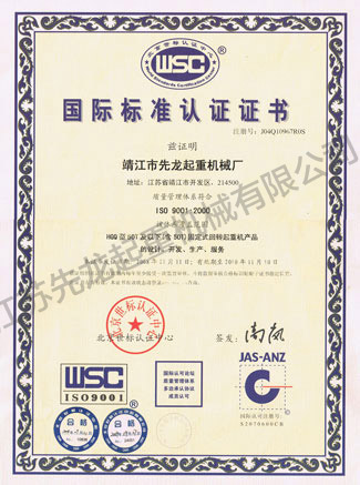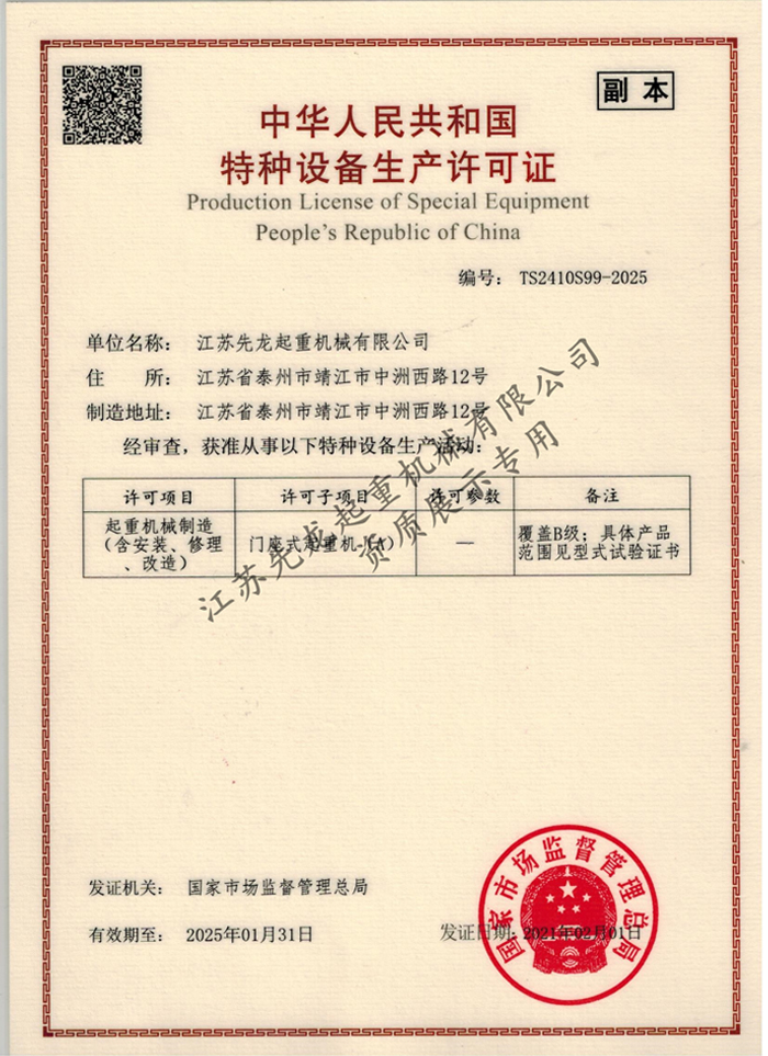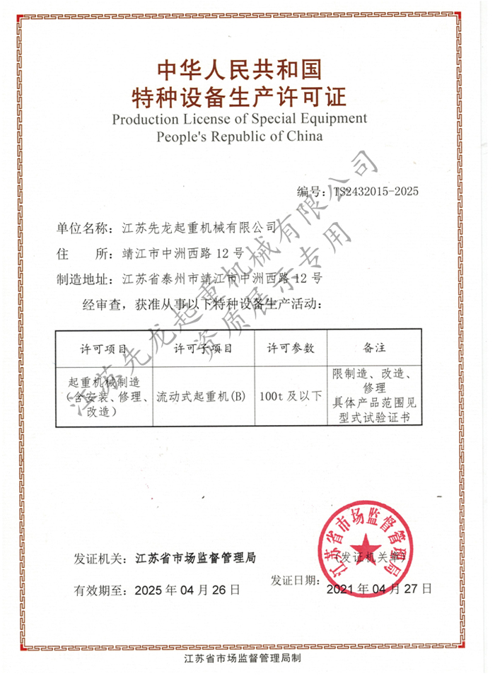 江蘇先龍起重機械有限公司(原靖江市先龍起重機械廠)是改制后的獨資企業(yè),本廠是生產(chǎn)起重運輸機械的專業(yè)化企業(yè),并先后通過了ISO9001:2000質(zhì)量管理體系認證、獲得國家頒發(fā)的HGQ50T固定式起重機和DLQ20T輪胎式起重機的特種設備制造許可證、特種設備安裝維修改造許可證。
